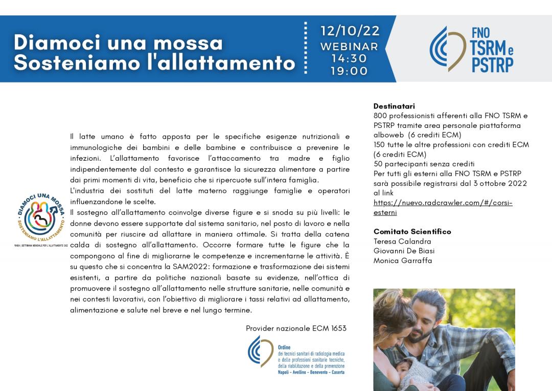In occasione della Settimana mondiale per l’allattamento materno, la Federazione ha promosso un webinar dal titolo “Diamoci una mossa, sosteniamo l’allattamento“, tenutosi il 12 ottobre 2022, andato in sold out in pochi giorni e che ha visto la partecipazione di vari professionisti sanitari affrontarne gli obiettivi principali: “attivare l’impegno delle figure coinvolte per realizzare un cambiamento effettivo, informare le persone sul ruolo che hanno nella catena calda di sostegno all’allattamento, radicare il concetto che l’allattamento garantisce alimentazione, sicurezza alimentare e riduzione delle disparità, allearsi con i soggetti e gli enti della catena calda di sostegno all’allattamento”.