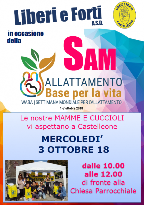 La Liberi e Forti ASD di Castelleone per il secondo anno ha aderito all’iniziativa SAM della settimana dell’allattamento mondiale con le MAMME del corso MAMME E CUCCIOLI lo scorso MERCOLEDI’ 3 ottobre dalle 10.00 alle 12.00 di fronte alla Chiesa Parrocchiale del paese durante il mercato settimanale.