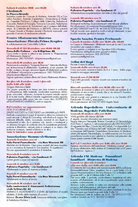 Iniziativa curata da: Comune di Modena, Azienda USL e Consultori Familiari, Azienda Ospedaliero – Universitaria di Modena, Ospedale Policlinico, Collegio delle Ostetriche, Pediatria di Comunità, Pediatri di Famiglia, Farmacie Comunali, Federfarma Modena, Associazioni di Volontariato per il sostegno dell’allattamento. Le Ostetriche del Policlinico e dell’AUSL saranno presenti in Piazza Grande a Modena durante il flashmob nazionale; sarà garantito il servizio di mediazione culturale