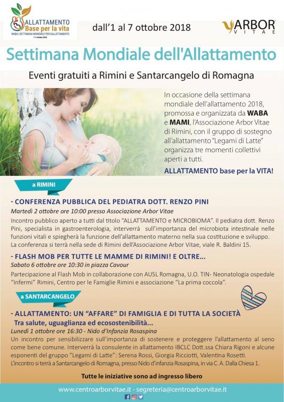 In occasione della settimana mondiale dell’allattamento 2018, promossa e organizzata da WABA e MAMI, l’Associazione Arbor Vitae di Rimini, con il gruppo di sostegno all’allattamento “Legami di Latte” organizza tre momenti collettivi aperti a tutti.