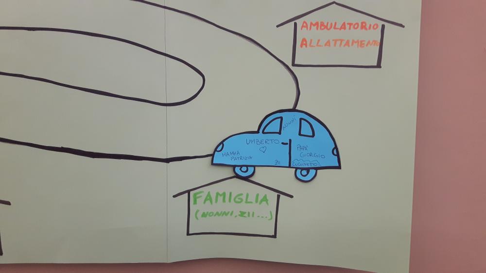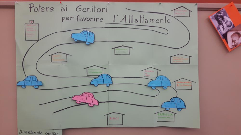 Il logo della SAM rappresentava una “squadra” che rafforza l’importanza di lavorare insieme per proteggere, promuovere e sostenere l’allattamento al seno, la crescita e lo sviluppo del neonato e, come immagine ricordo, abbiamo costruito una sorta di “circuito automobilistico”, metafora della nuova della nuova vita che ogni famiglia intraprende con l’arrivo di un figlio. Lungo il percorso abbiamo riportato le strutture ele azioni che possono intervenire a tutela e sostegno: consultorio, ambulatorio di consulenza allattamento, servizio di psicologia….. Ogni partecipante ha poi apposto una macchinina (rosa o azzurra) sul percorso con i nomi di chi ha contribuito al supporto e incoraggiamento.