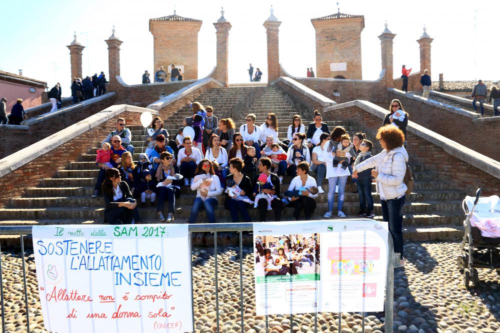 Il flash mob in occasione della SAM 2017 a Comacchio, è stato realizzato sabato 7 ottobre ai piedi della scalinata centrale dei Trepponti. Numerosa la partecipazione da parte di mamme che allattano e che hanno allattato, di mamme in attesa e anche di papà. Erano presenti anche le ostetriche del servizio Salute Donna di Comacchio della ASL, e una rappresentanza del Comune di Comacchio.