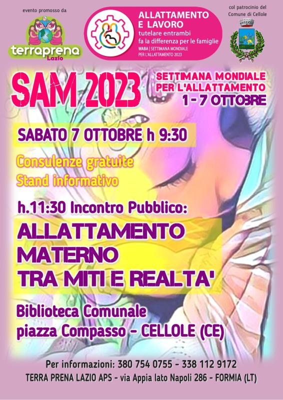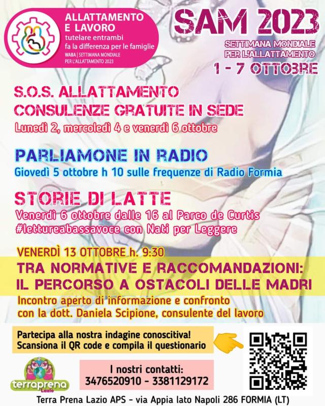 | 2,4,6 ottobre Consulenze gratuite in sede 5 ottobre Intervento su Radio Formia 6 ottobre STORIE DI LATTE Pomeriggio al parco con racconti e letture in collaborazione con Nati per Leggere 7 ottobre – giornata di sensibilizzazione con stand informativo, spazio consulenze e incontro pubblico presso la biblioteca comunale di Cellole, CE 13 ottobre Incontro in-formativo con Daniela Scipione mamma di tre figli e consulente del lavoro . PARTECIPA ALL’INDAGINE CONOSCITIVA SUL TEMA “Allattamento e lavoro: tutelare entrambi fa la differenza per le famiglie”. |