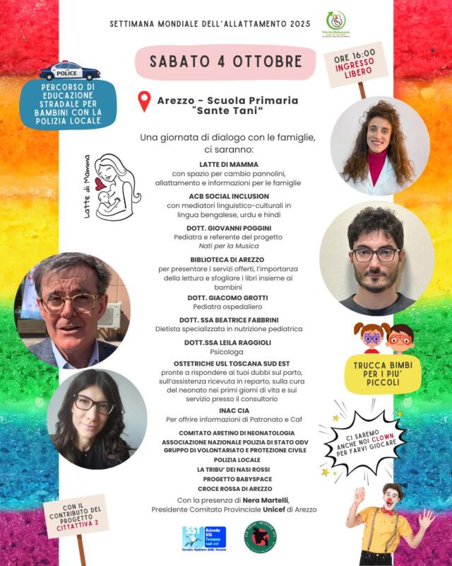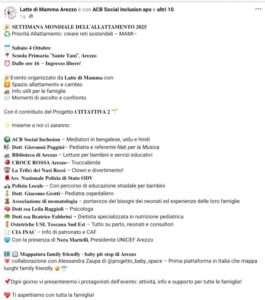 SAM 2025 ad Arezzo 28 Set 2025 | Eventi SAM 2025, Toscana Notizie | 0 | In occasione della Settimana Mondiale per l’Allattamento l’associazione Latte di Mamma invita sabato 4 ottobre, dalle ore 16, presso la Scuola Primaria “Sante Tani” per un ricco programma di incontri! Clicca sulle immagini per ingrandirle: